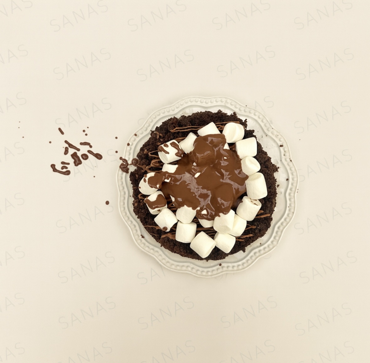 كيكة الشوكلاتة الفاخره ومغطاه بقطع المارشميلو مع علبة من صوص الشوكلاتة